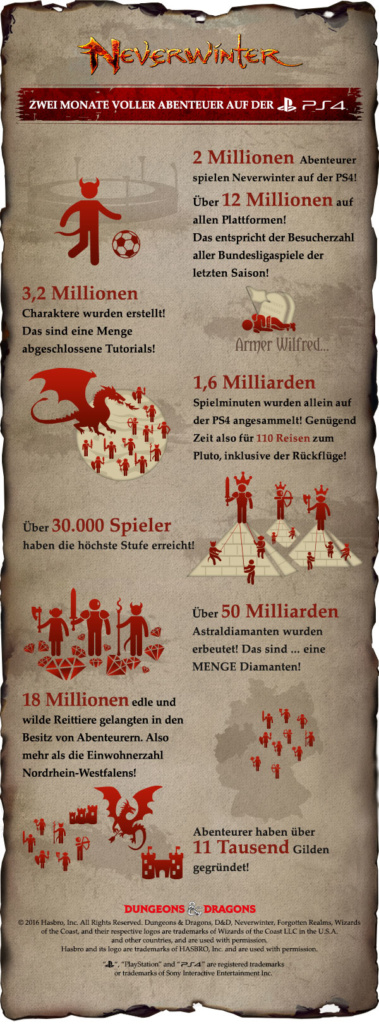 Am Mittwoch haben Perfect World Europe B.V., einer der führenden Publisher von free-to-play MMORPGS, und Cryptic Studios bekannt gegeben, dass Neverwinter – das auf Dungeons & Dragons basierende free-to-play MMORPG – auf der PlayStation®4 von mehr als 2 Millionen Spielern gespielt wird. Das Spiel hat mittlerweile auf allen drei Plattformen (PC, Xbox One, PS4) über 12 Millionen Spieler angezogen.