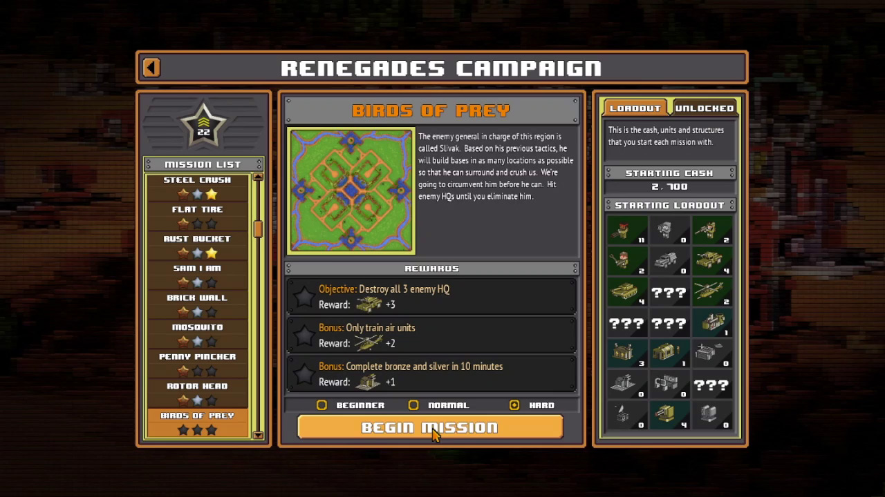 8-Bit Armies von Petroglyph. In der elften Mission (BIRDS OF PREY) der Beta von 8-Bit Armies gilt es alle 3 HQs zu zerstören, also die gegnerischen Hauptquartiere der KI. Wer die Bonus Punkte noch mitnehmen möchte, der darf nur Lufteinheiten Produzieren! Keine Panzer, keine Infanterie! Und wie immer müsst Ihr die Mission innerhalb von 10 Minuten erfolgreich gemeistert haben.